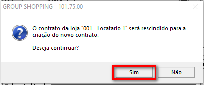 A mensagem de alerta abaixo será exibida, informando que o contrato base selecionado será rescindido. Clique no botão Sim.