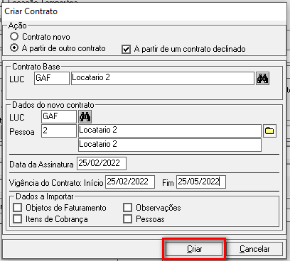Em Dados a importar é possível selecionar as informações que serão copiadas do contrato selecionado.