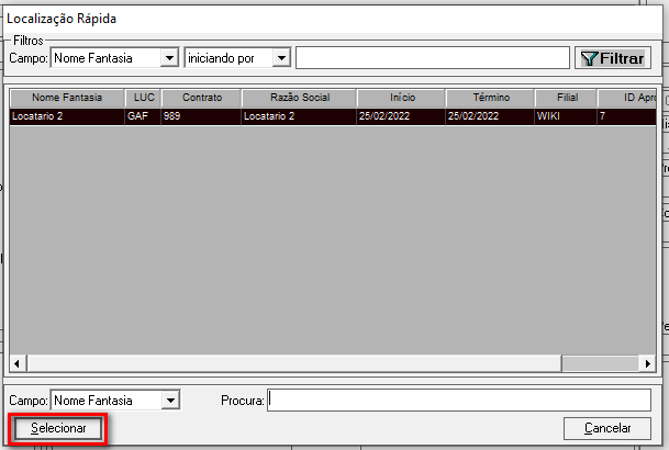 Selecione o contrato desejado e clique no botão Selecionar.