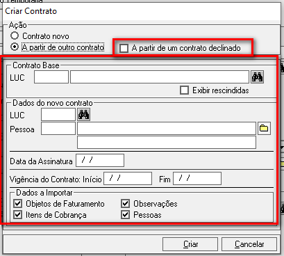 Selecione a opção A partir de outro contrato. O sistema habilitará a opção A partir de um contrato declinado. Selecione essa opção.