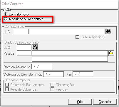 O sistema exibirá a tela abaixo. Selecione a opção A partir de outro contrato.