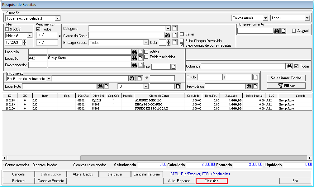 Com as contas selecionadas vamos clicar sobre a opção “Classificar”, selecionar a classificação e clicar sobre o botão “Aplicar”.