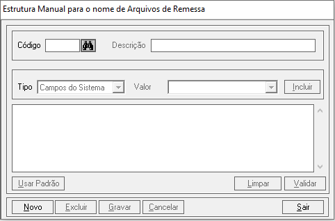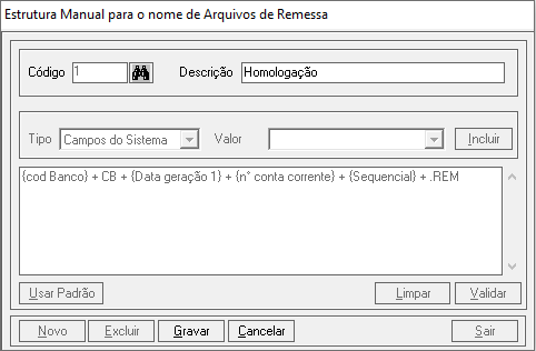 No formulário ‘Estrutura Manual para o nome de Arquivos de Remessa’ é necessário informar uma descrição e uma estrutura válida para o nome do arquivo. Existem diversas opções para a definição da estrutura, tais como: Campos do Sistema, Fixo, Data da Geração e Sequencial.