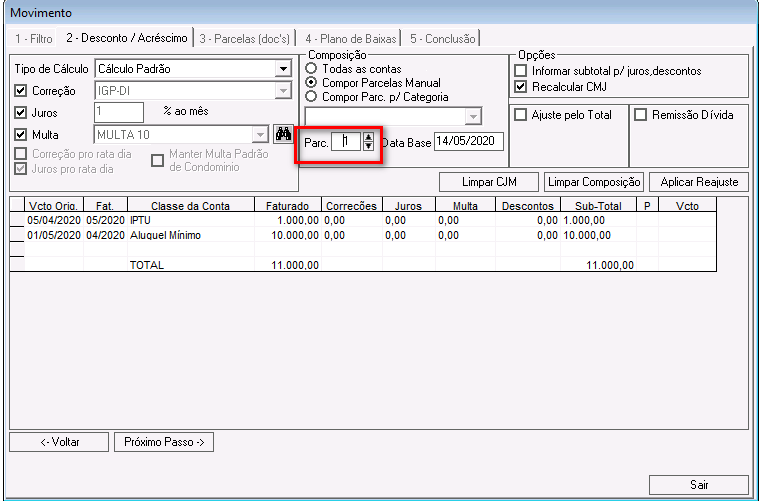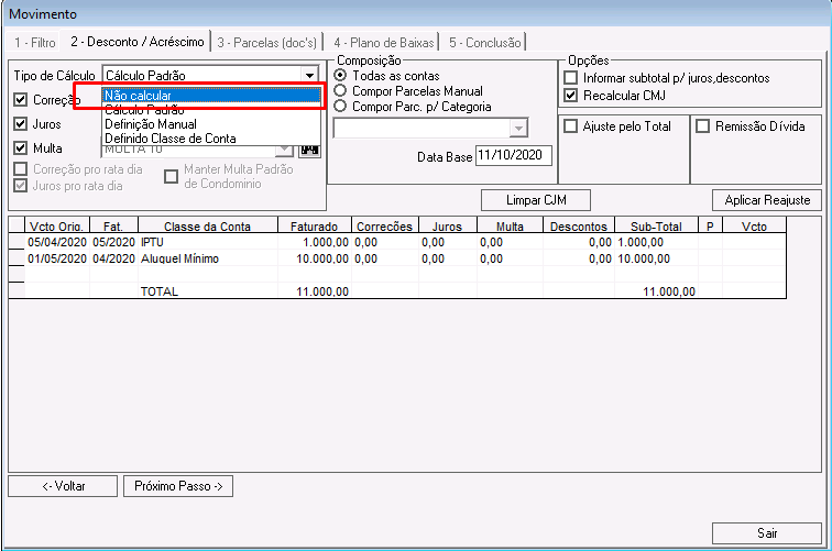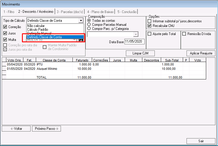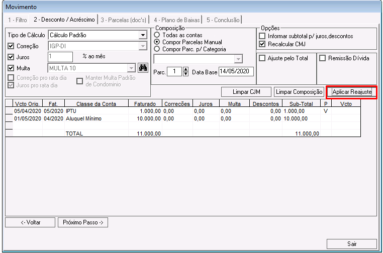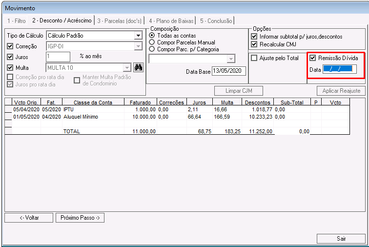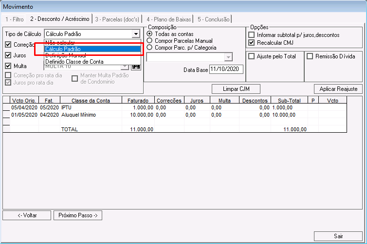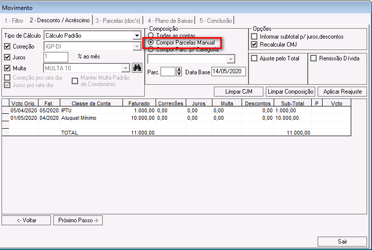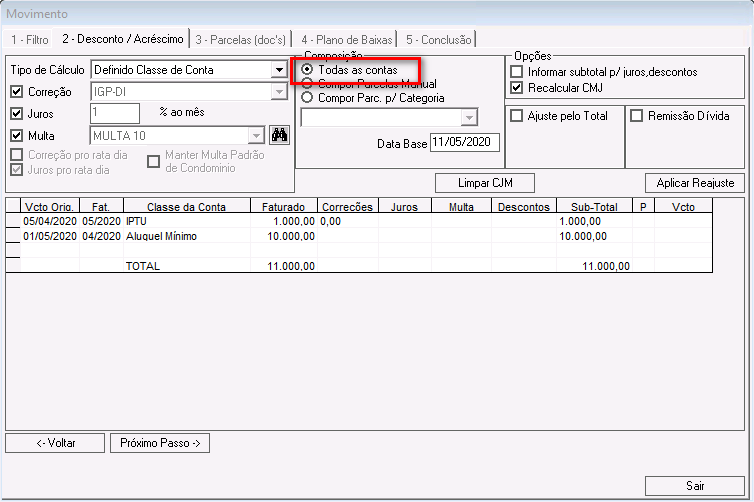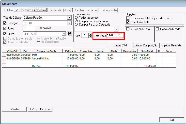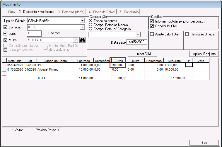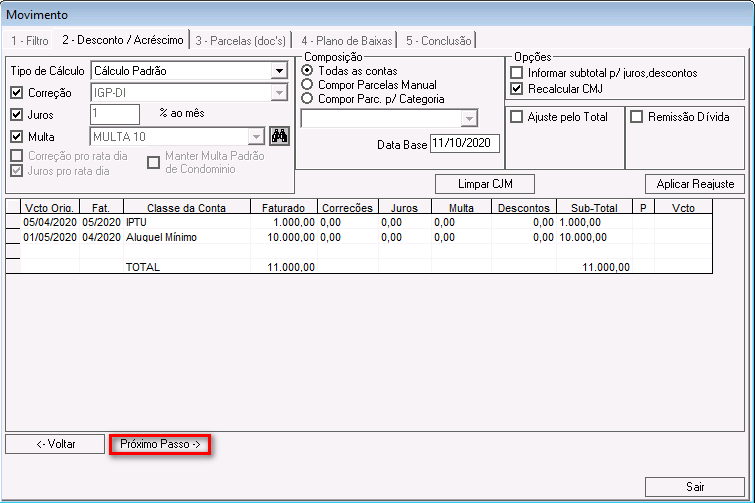 Nessa etapa é possível calcular correções, juros, multas e descontos para os lançamentos que compõem o acordo.