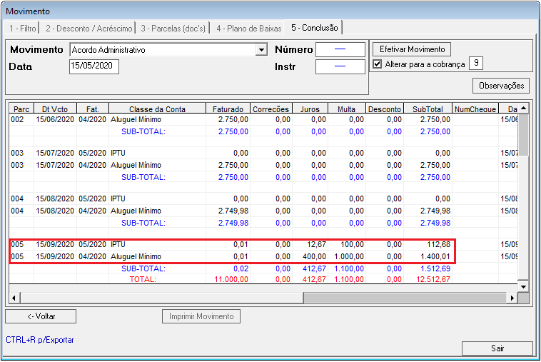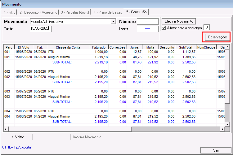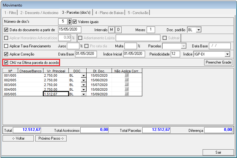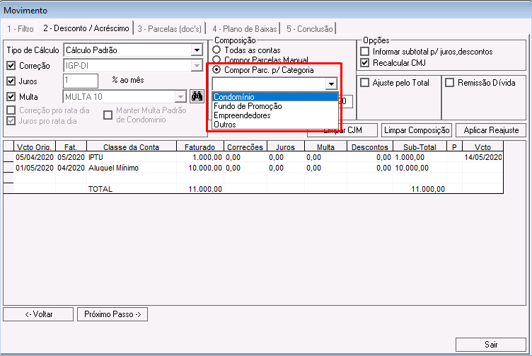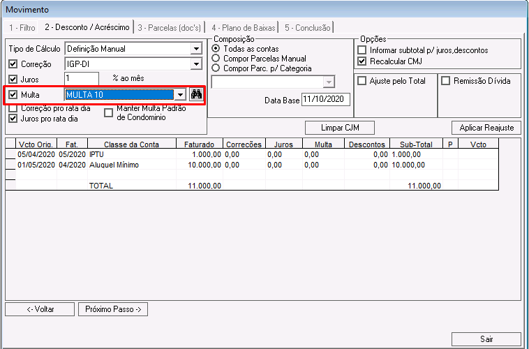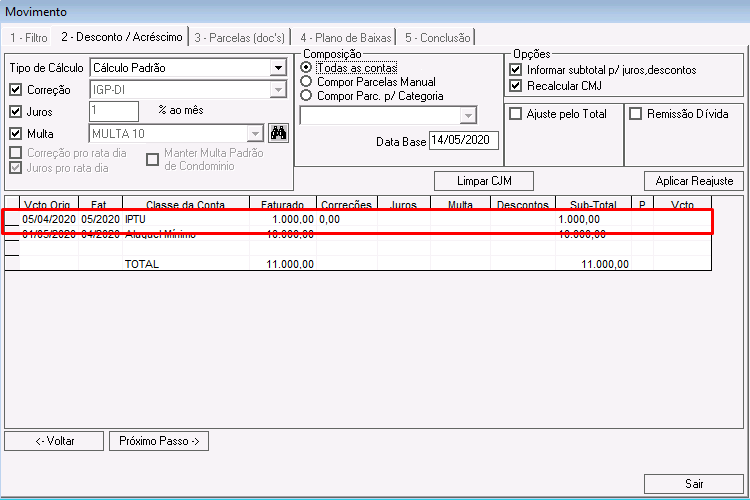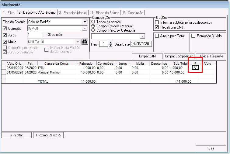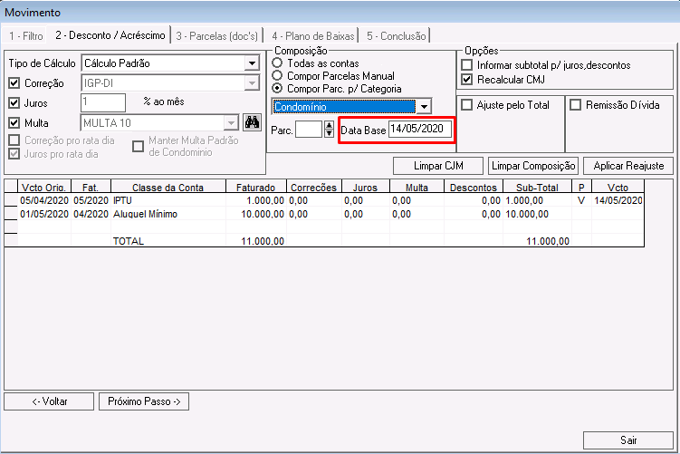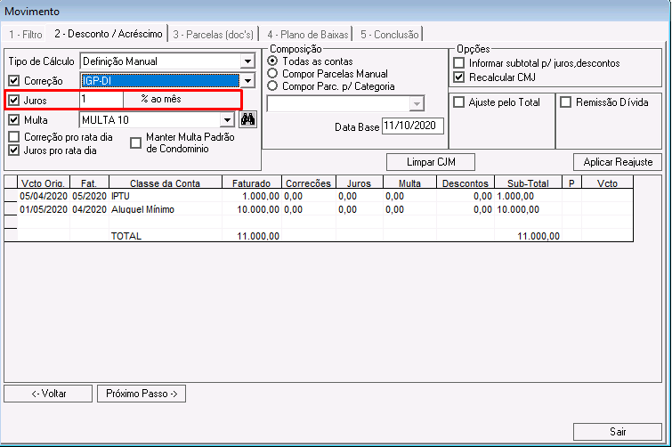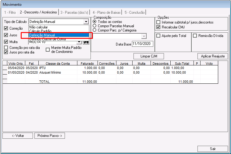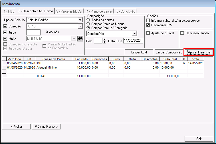 Nessa etapa é possível calcular correções, juros, multas e descontos para os lançamentos que compõem o acordo.
