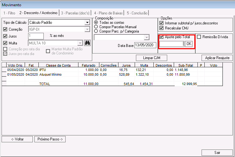 Ajuste pelo total: se marcada, será possível informar o valor total do acordo.