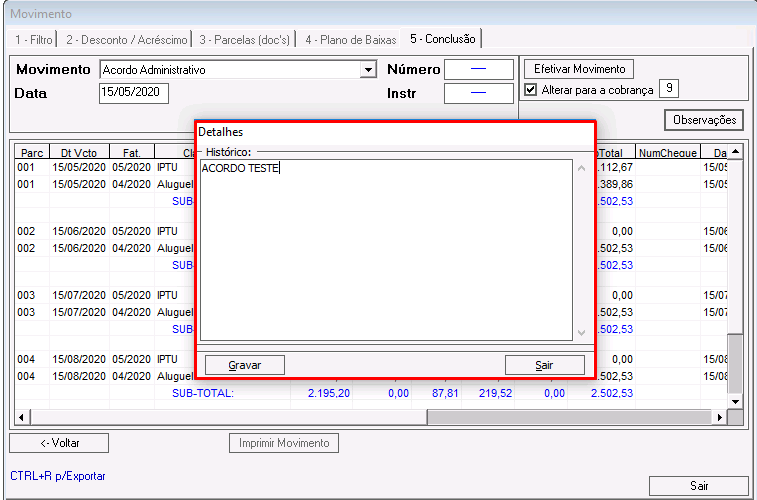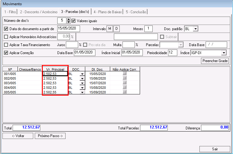 Vr. Principal: valor total da parcela. Nesse campo pode ser realizado ajuste no valor das parcelas, porém respeitando o valor total do acordo.