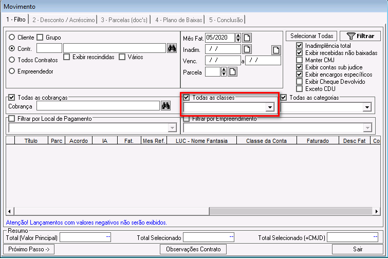 Todas as classes: por padrão, essa opção fica habilitada no sistema. Se desmarcada, será possível selecionar os lançamentos de uma classe específica.