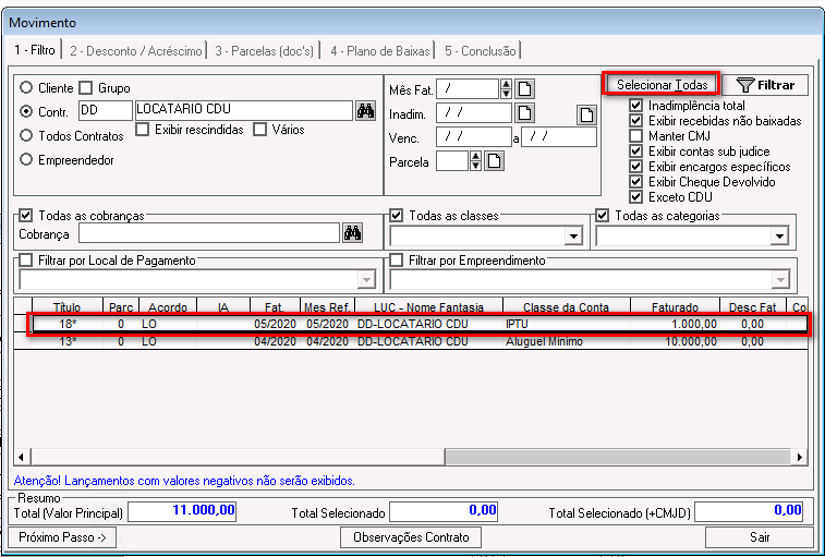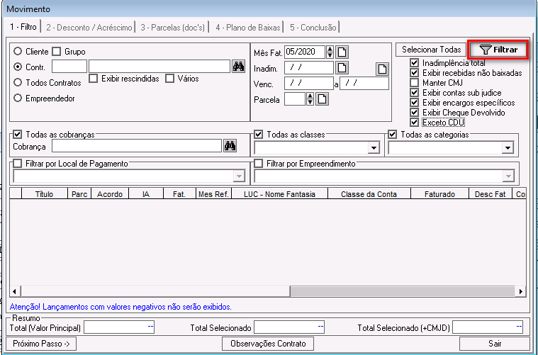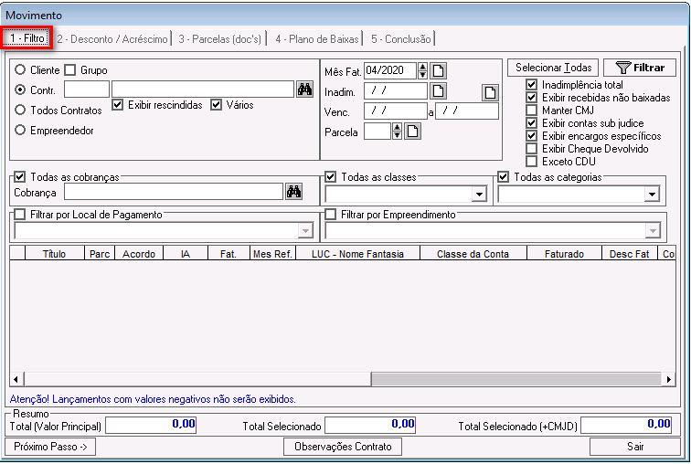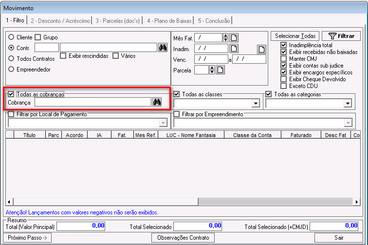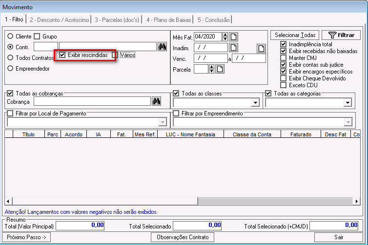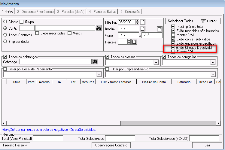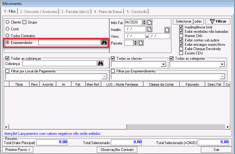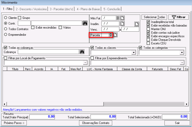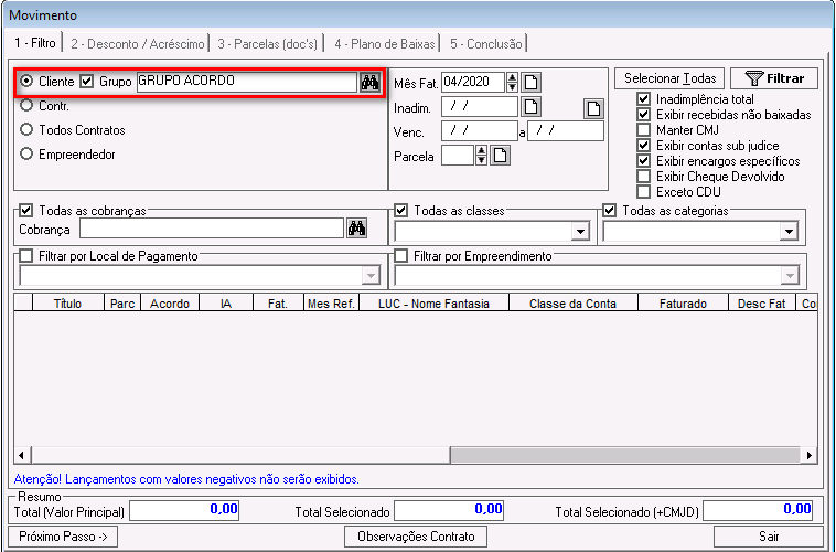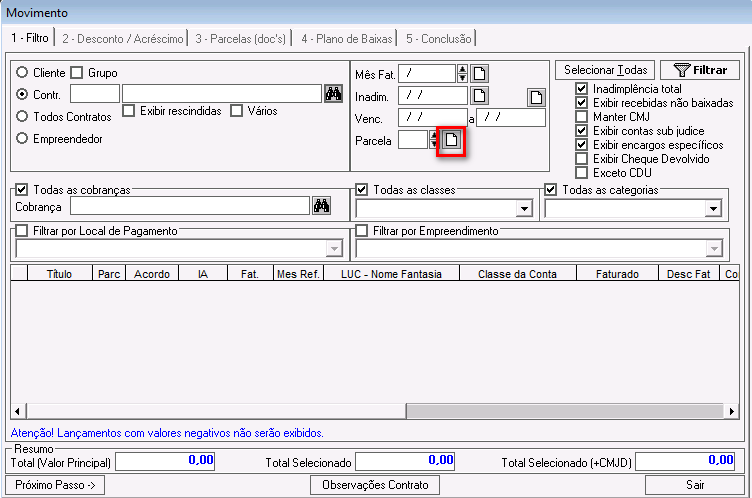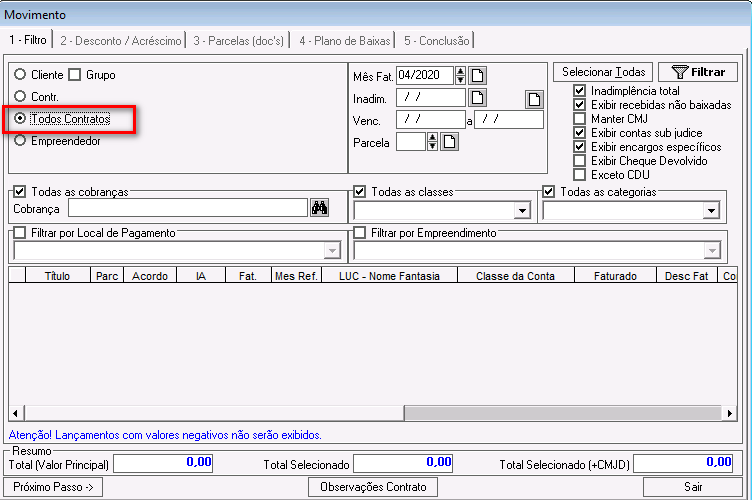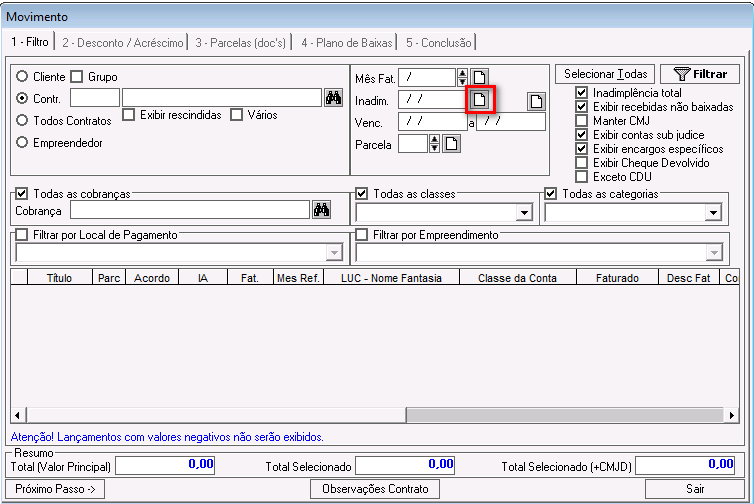 Inadimplência total: esse parâmetro foi descontinuado. Ele pode ficar marcado ou desmarcado e não impactará nos demais filtros.