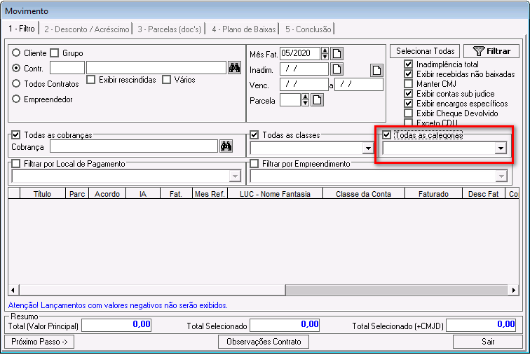Todas as categorias: por padrão, essa opção fica habilitada no sistema. Se desmarcada, será possível selecionar os lançamentos de uma categoria específica.