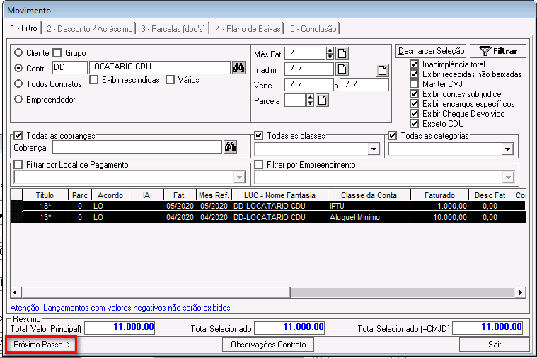 Obs.: Se não houver incidência de correções, juros, multas ou desconto, clique no botão Próximo Passo para avançar para a próxima etapa do acordo.