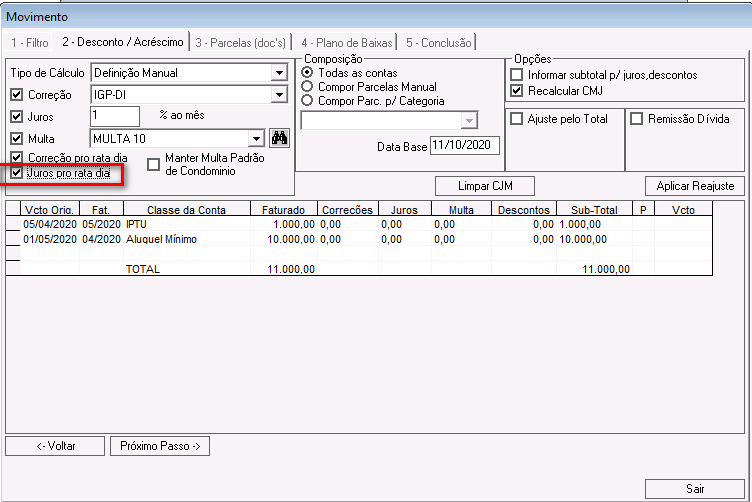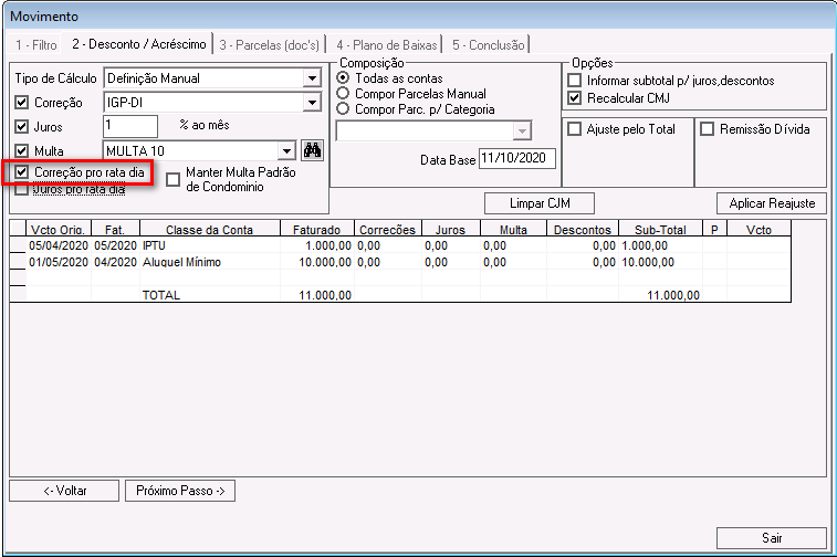 Correção pro rata dia: se marcada, o cálculo da correção será realizado por pro rata, de acordo com o número de dias em atraso.