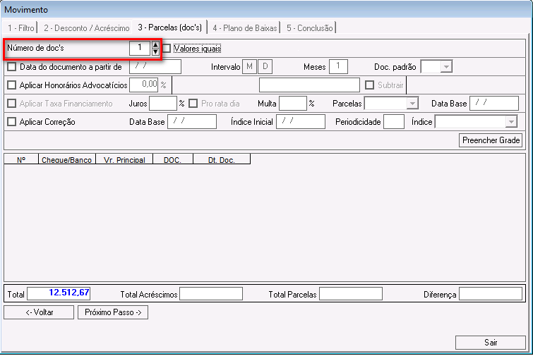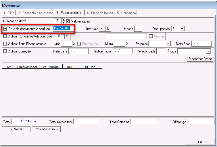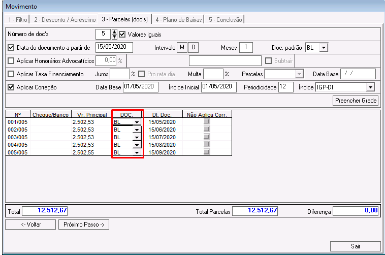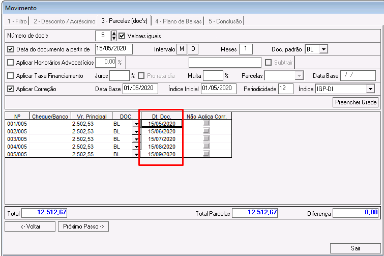 Dt. Doc: nesse campo é possível alterar a data de vencimento da parcela.