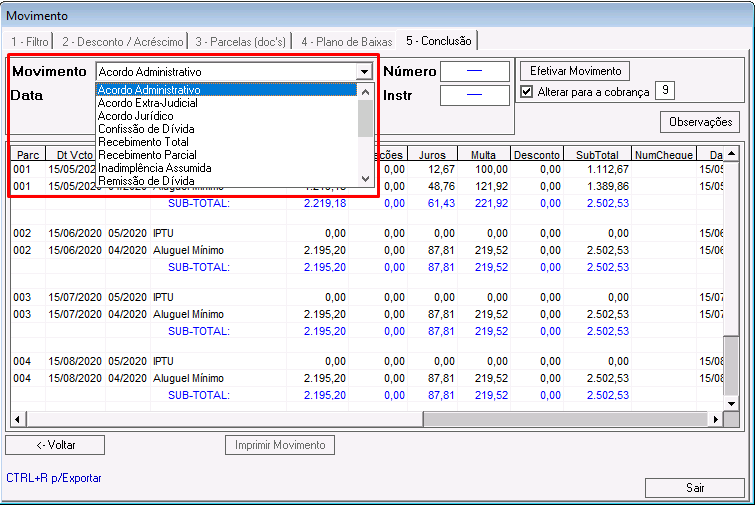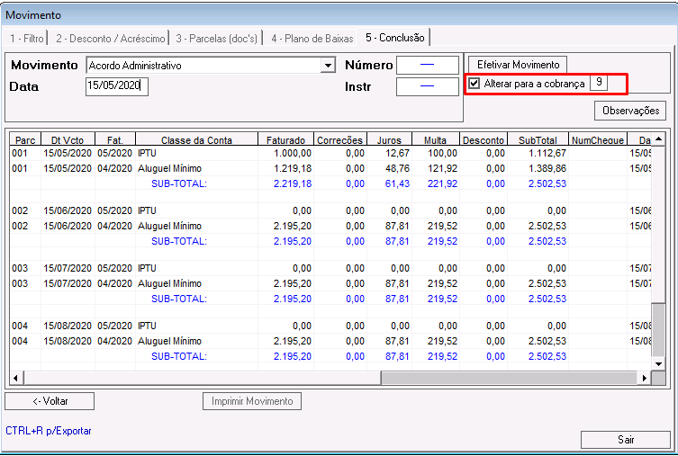 Alterar para a cobrança: nesse campo é definido o sequencial de cobrança dos lançamentos vinculados ao acordo. Por padrão, é preenchido com o sequencial 9.