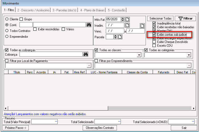 Exibir Contas Sub Judice: se marcada, o sistema considerará nas consultas, os lançamentos na situação Sub Judice.