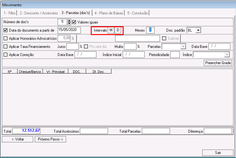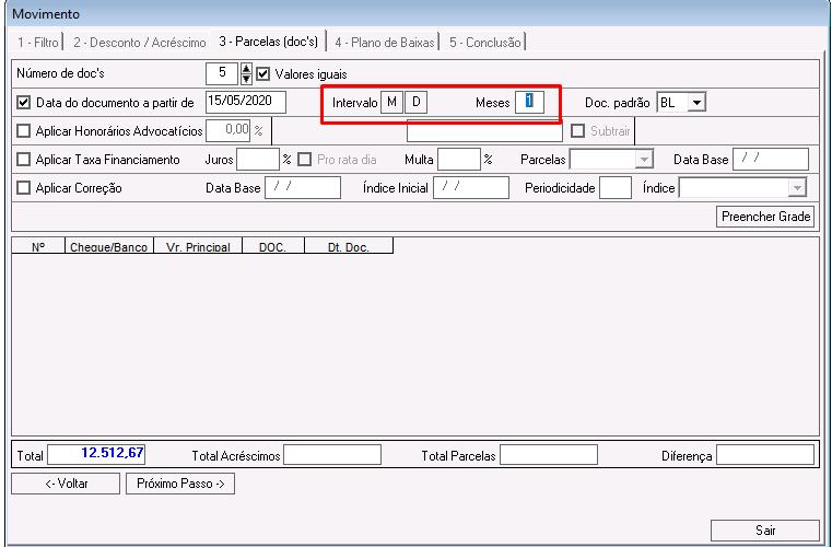 Se marcada a opção M(meses), as parcelas serão geradas no intervalo de meses preenchido no campo Meses, considerando como data inicial, a data preenchida no campo Data do documento a partir de.