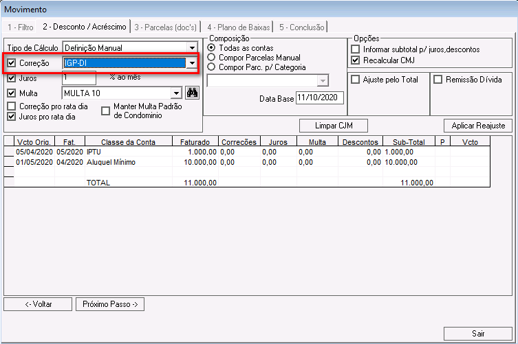 Correção: se marcada, deve ser selecionado o índice monetário para cálculo da correção.
