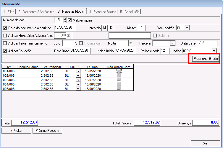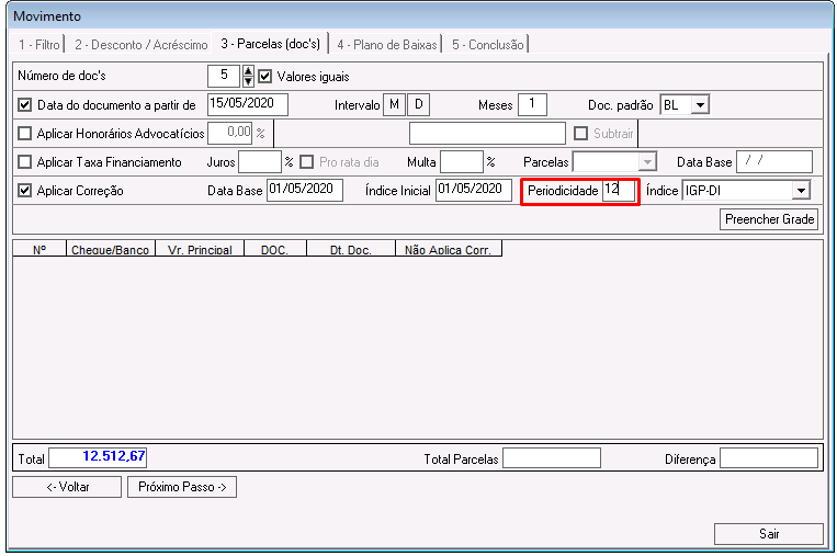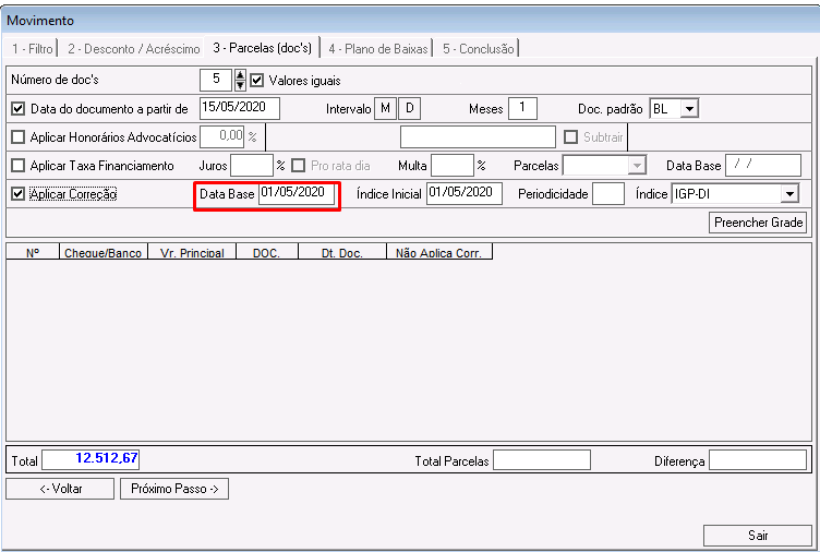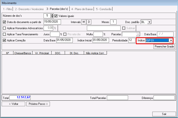 Índice Inicial: índice inicial que o sistema considerará para reajustar as parcelas.
