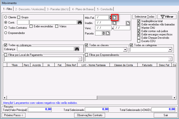 Mês Fat.: campo para informar um mês de faturamento específico. Se preenchido, ao filtrar, o sistema buscará somente os lançamentos faturados para esse mês.