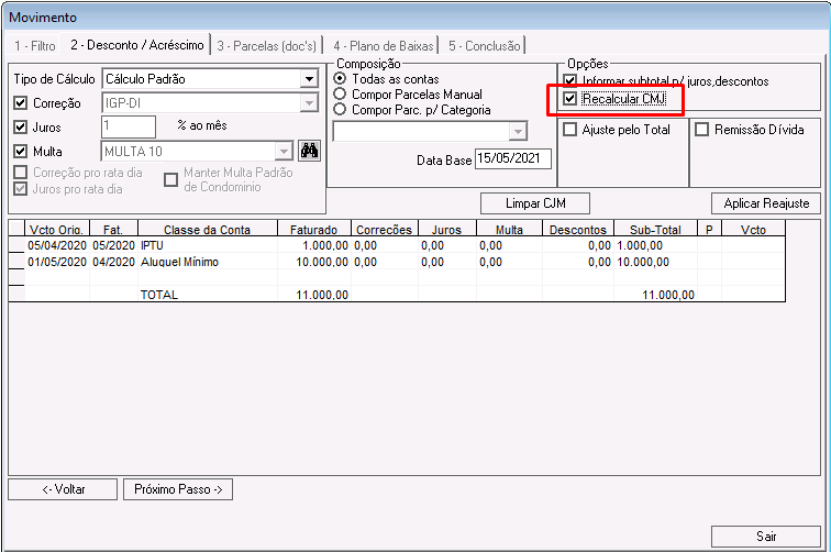 Recalcular CMJ: se marcada, ao aplicar o reajuste, o sistema recalculará os valores de juros, multas e correções dos lançamentos. Se desmarcada, os valores não serão atualizados.