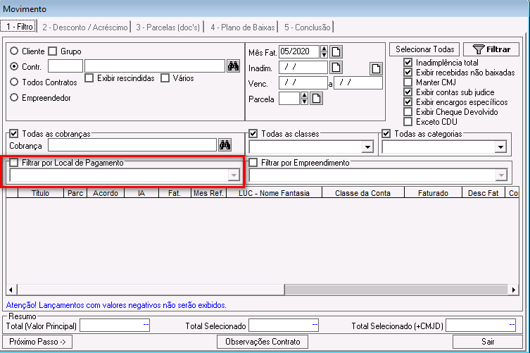 Filtrar por local de Pagamento: por padrão, essa opção fica desabilitada no sistema. Se marcada, será possível selecionar os lançamentos emitidos para um local de pagamento específico.