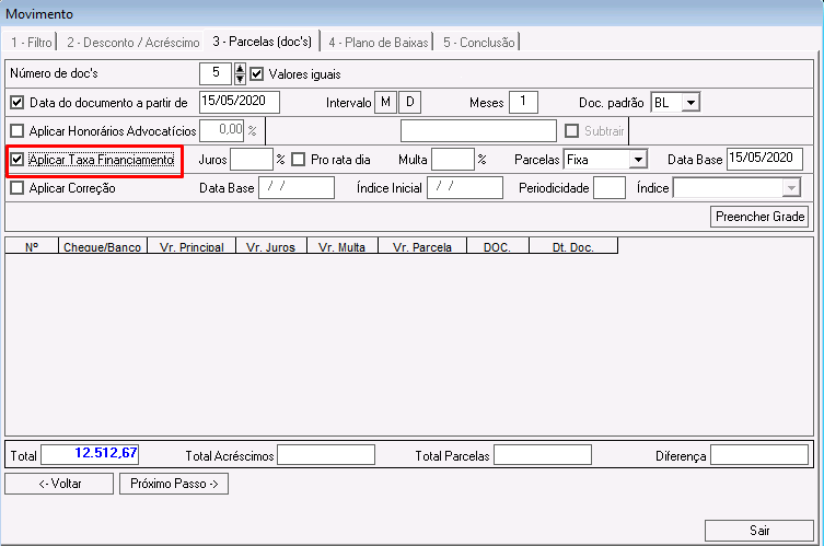 Aplicar Taxa de Financiamento: se marcada, serão habilitados os campos Juros, Pro rata dia, Multa, Parcelas e Data Base. Clique aqui para acessar a documentação sobre Taxa de Financiamento.