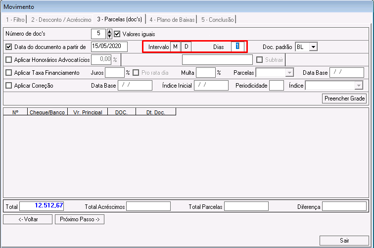 Marcando a opção D(dia), as parcelas serão geradas no intervalo de dias preenchido no campo Dias, considerando como data inicial, a data preenchida no campo Data do documento a partir de.