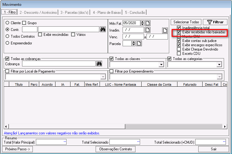 Exibir recebidas não baixadas: se marcada, o sistema considerará nas consultas, os lançamentos na situação emitida recebida (Lançamentos que possuem data de recebimento porem não possuem data de liquidação).