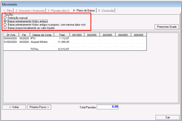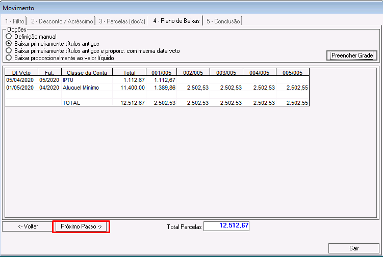 Nessa etapa deve ser selecionado o plano de baixa dos lançamentos que compõem o acordo. Clique aqui para visualizar a documentação sobre planos de baixas.