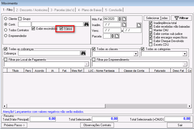 Marcando opção Vários, o sistema permitirá que seja selecionado mais de um contrato.