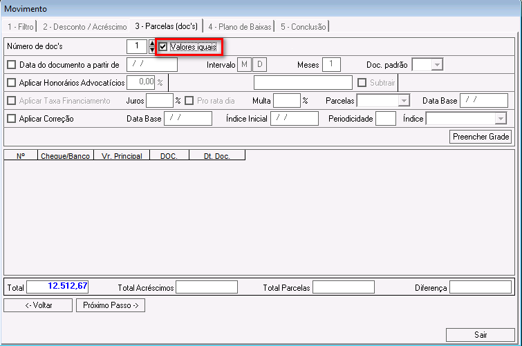 Valores iguais: se marcada, todas as parcelas do acordo serão geradas com o mesmo valor.