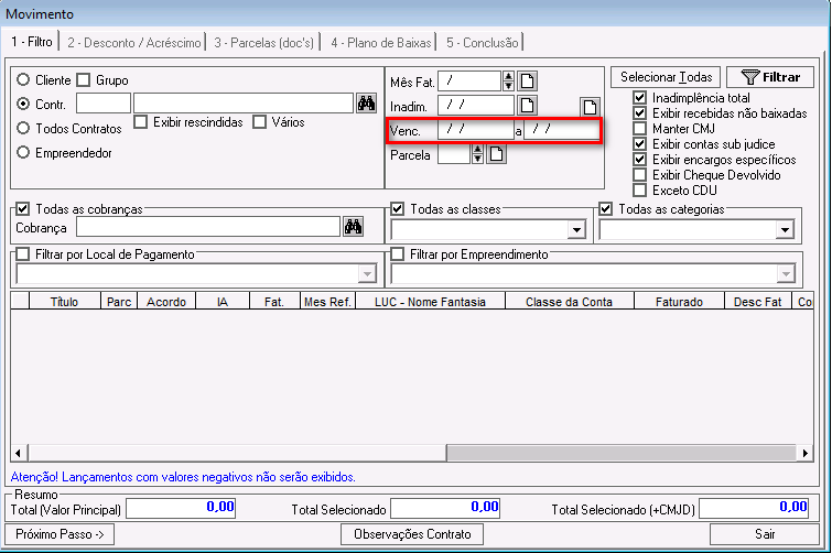 Venc.: campo utilizado para informar um período de vencimento dos lançamentos faturados.
