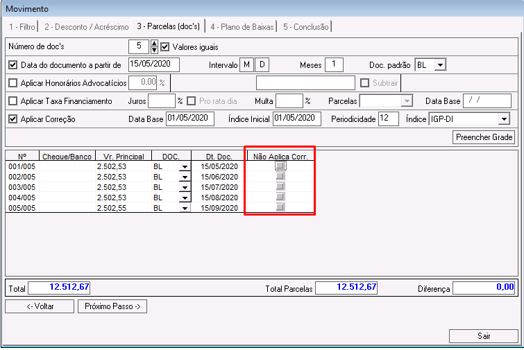 Não Aplica Corr.: nesse campo é possível selecionar as parcelas não sofrerão reajustes.