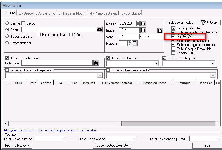 Manter CMJ: se marcada, ao selecionar lançamentos que já compõem outro acordo, o sistema enviará as informações de juros, multas e correções para o passo 2 - Descontos - Acréscimos. Se desmarcada, as informações de juros, multas e correções serão enviadas zeradas para o passo 2 - Descontos - Acréscimos.