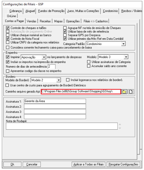 Acesse o menu Cadastros > Shoppings (Filiais) > Configurações Avançadas > Aba “Contas a Pagar”.
