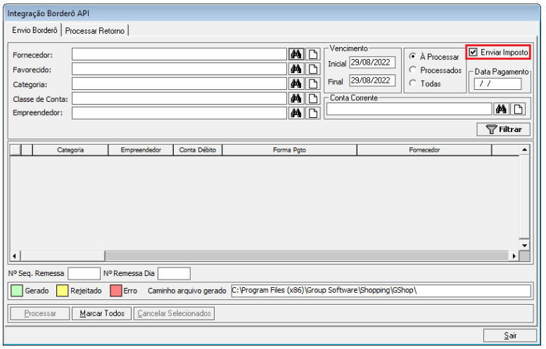 o parâmetro de filtro “Enviar Imposto”.