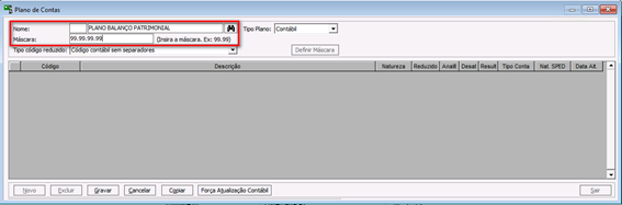 1.2 - Procedimentos para o cadastro do plano Balanço Patrimonial sem copiar os dados de um plano já existente