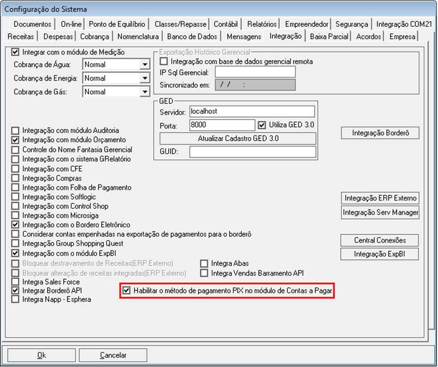 Com a opção o novo borderô eletrônico configurado, a opção “Habilitar o método de pagamento PIX no módulo de Contas a Pagar” estará disponível na aba Integração do formulário de Configurações do Sistema.