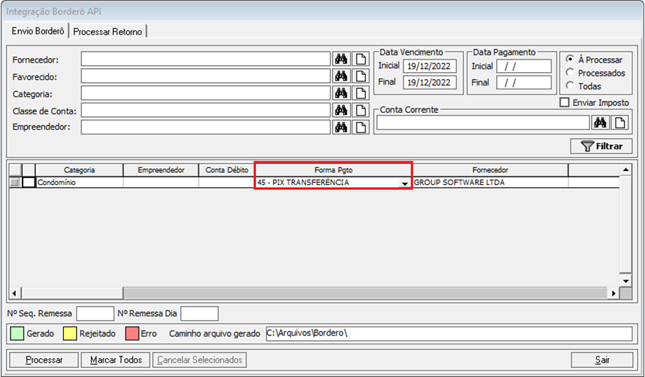 Feito todo o processo no módulo de contas a pagar, o registro estará disponível para a geração do arquivo através do formulário de “Integração Borderô API” presente no módulo de Importação/ Exportação. A coluna ‘Forma de Pagamento’ já virá preenchida por padrão com a opção “45 – PIX Transferência”.